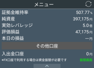 先月は『最近、建玉損益が徐々にマイナスが嵩んできています。実効レバレッジが上がってきてしまっていて、ちょっと足出てますが、まだ許容範囲内かなと思います。できれば3倍程度に抑えたいですけど、4倍出てなければまあいいかな。証拠金維持率500%は超えてますし!て感じです。』とか言ってました。